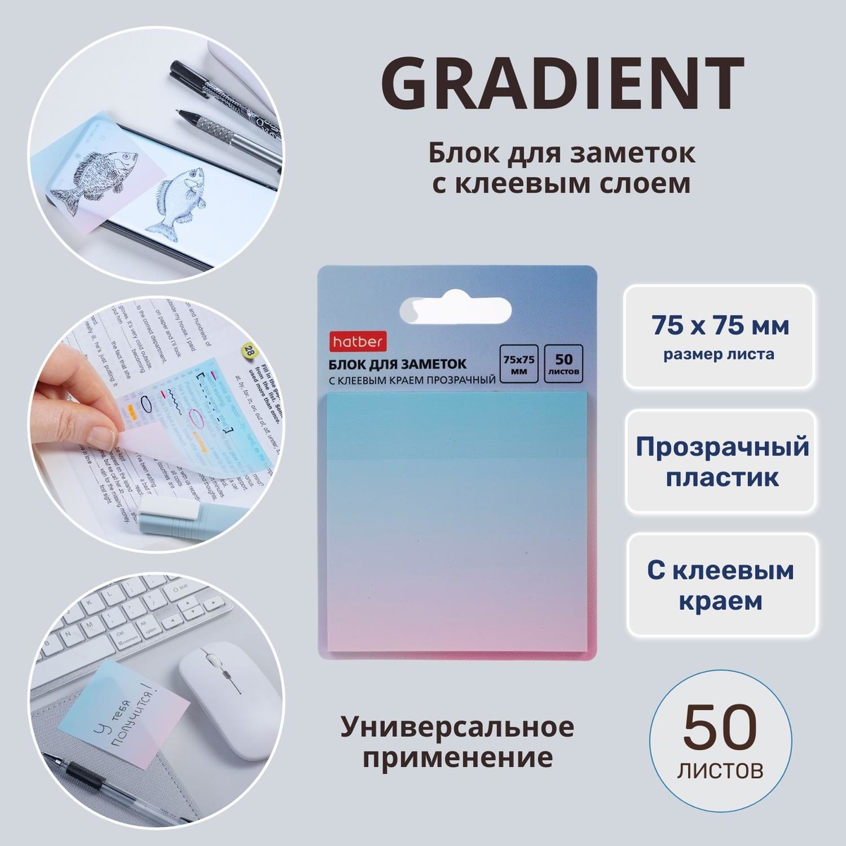 Блок для заметок Gradient из прозрачного пластика с клеевым краем от Hatber: тонко, почти незаметно