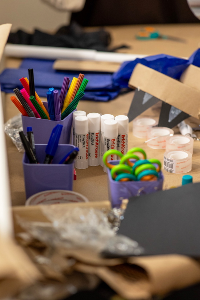 В рамках мастер-классов гости фестиваля создавали головные уборы, аксессуары, короны, воротники, манжеты и бумажные цветы из цветной бумаги ErichKrause Jolly Friends, а также работали над зин-коллажем «Итоги года» и коллажем «Снежники».