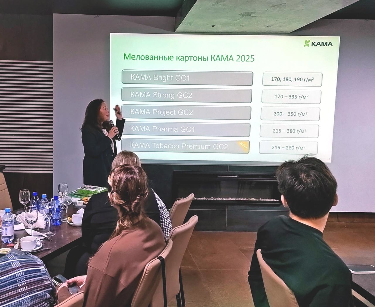 Ключевой темой встречи стали специализированные решения для конкретных задач клиентов. В рамках семинара менеджер по работе с ключевыми клиентами Ольга Соболева представила продукты, которые уже сегодня на равных конкурируют с ведущими мировыми брендами. Особый интерес вызвал премиальный картон КАМА Pharma. Его ключевое преимущество — повышенная белизна, которая на 3,5 % выше, чем у зарубежных аналогов. Это делает его идеальным решением для упаковки, где требуются яркие цветовые эффекты и сложные отделочные операции.