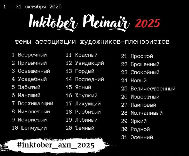 Марафон проходит в соцсети «ВКонтакте». Участникам предлагается рисовать любыми материалами, но только в монохроме. В этом году так же, как и в прошлом, можно добавить немного красного цвета. Хештеги марафона — #inktober_ахп_2025 и #pleinair_russia.
