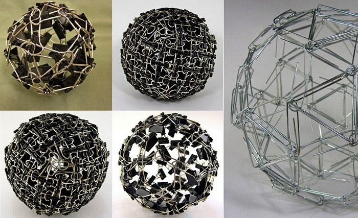 Так и появляются на свет удивительные фигуры, вроде Impenetraball, плотного шара из 132 канцелярских биндеров, или же светящегося изнутри "ежика", созданного из пластмассовых палочек от леденцов, скрепленных резинками "для денег". На какие творческие подвиги способен аспирант кафедры математики Закари Абель, можно узнать на его интернет-сайте.