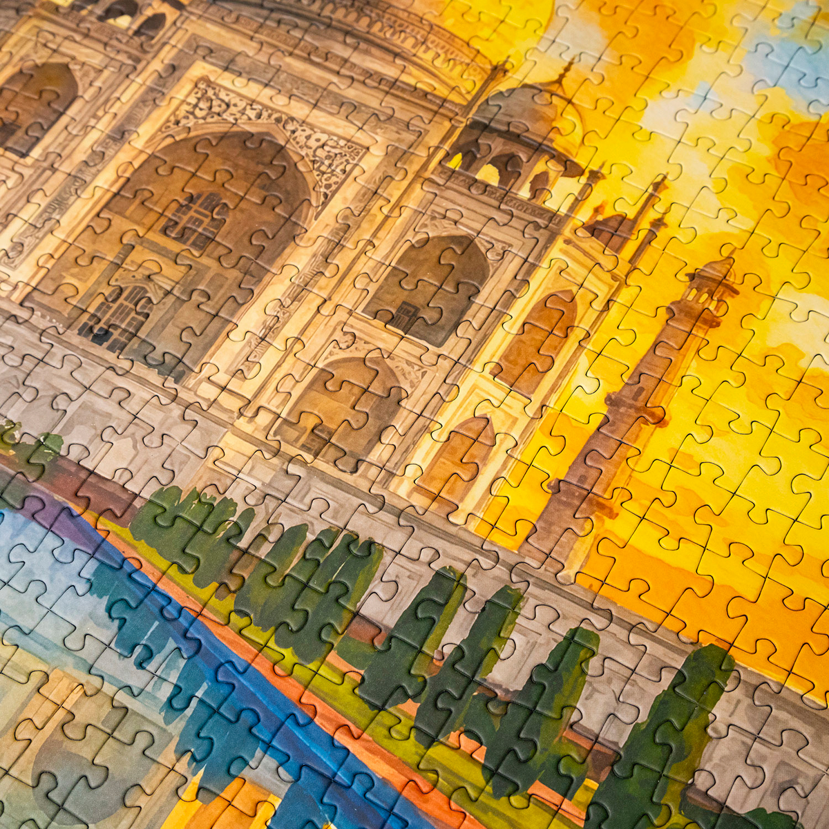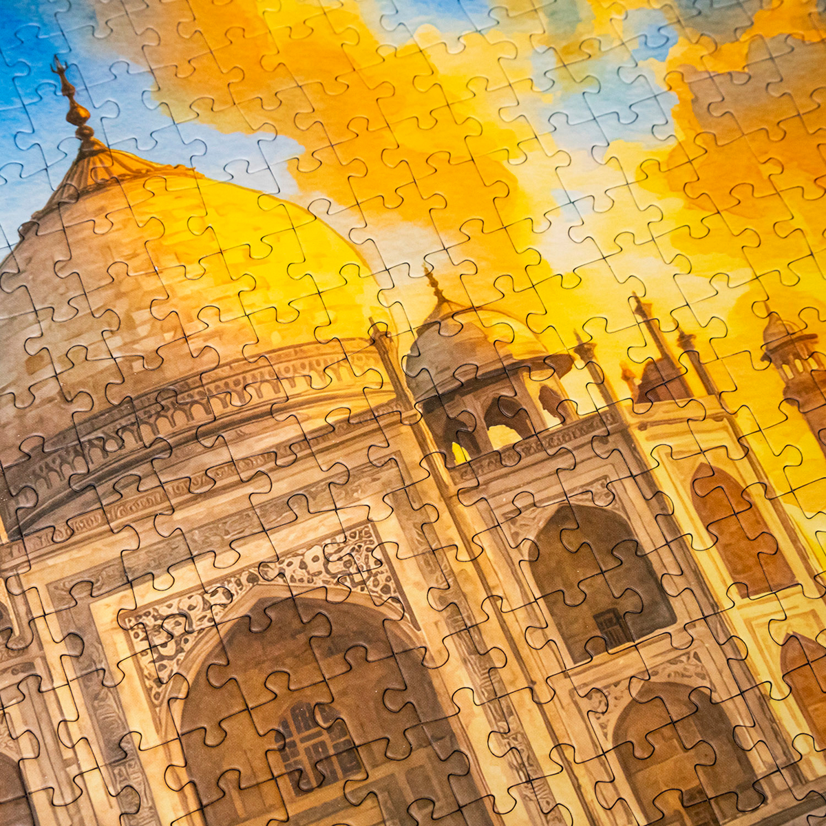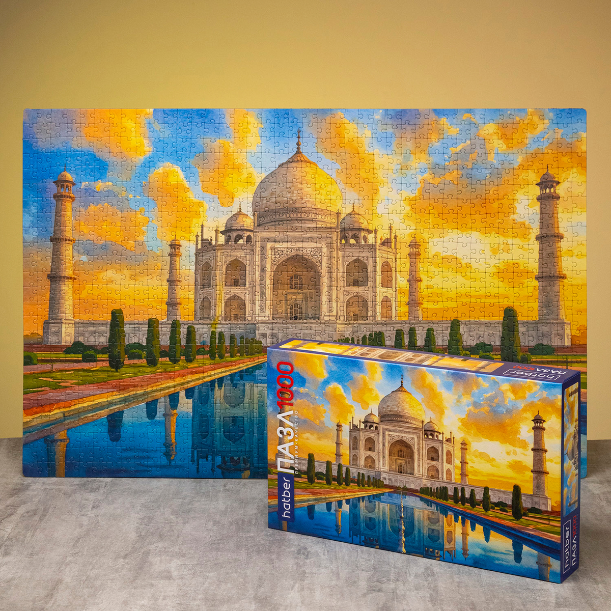 Пазл «Тадж‑Махал» — это 1000 элементов для тех, кто любит архитектуру, путешествия и атмосферные закаты. Пока за окном обычный вечер, на столе медленно собирается дворец из сияющего мрамора и теплого закатного света, превращая сборку в тихую гавань.