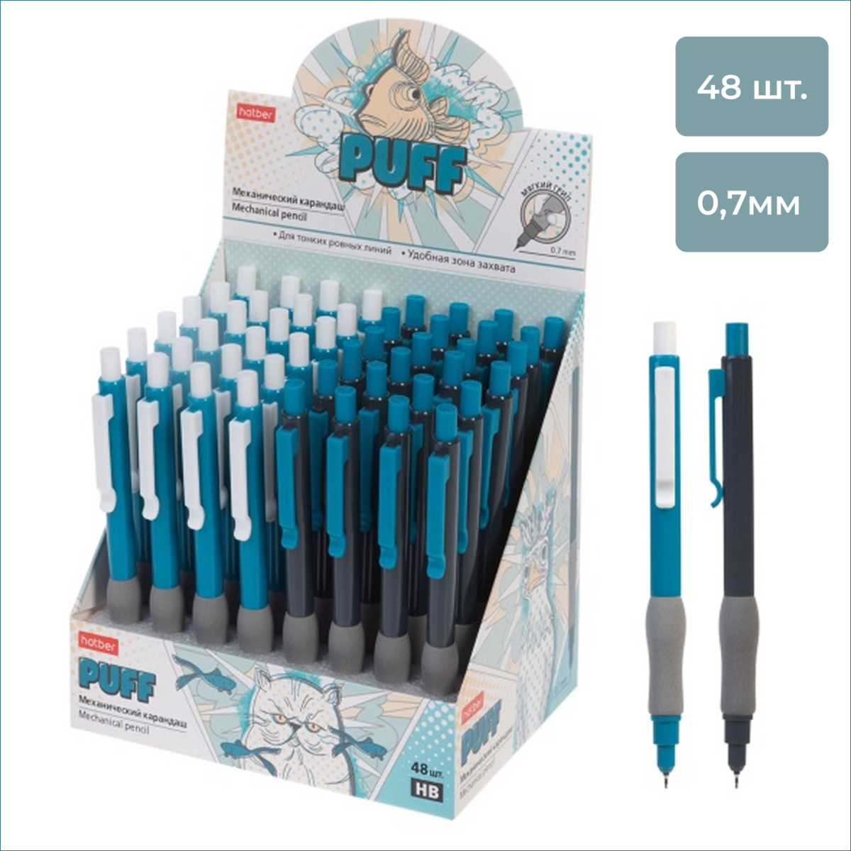 Карандаши Puff HB_0,7 мм предназначены для максимально комфортного использования – их эргономичный корпус с мягким грипом снижает усталость руки. Запасной грифель и клип также повышают удобство модели. Упаковка — картонный дисплей 48 шт.