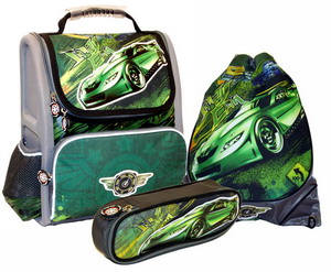 В набор входят рюкзак, пенал и мешок для обуви, выполненные в едином стиле. Коллекция сделана из качественного полиэстера, в качестве деталей оформления используются прорезиненные подвески на молнии в форме автомобильных колес, машинка и эмблемы из полиуретана.