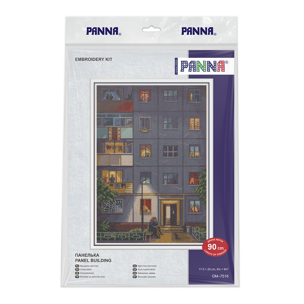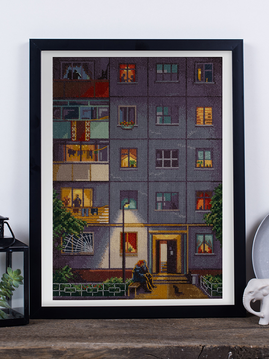 В продажу поступил новый набор для вышивания PANNA  (арт. GM-7516) с атмосферным ностальгическим сюжетом. Это словно кадр из детских воспоминаний: летний вечер у подъезда панельной многоэтажки, бабушки на лавочке под фонарем, свет в окнах. Таких дворов сегодня всё меньше, а вышивка сохранит этот уютный мир навсегда. Дизайн выделяется среди классических наборов и заинтересует тех, кто ищет небанальные городские мотивы.
