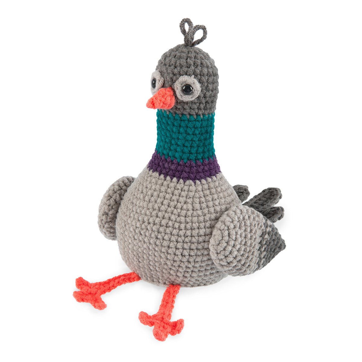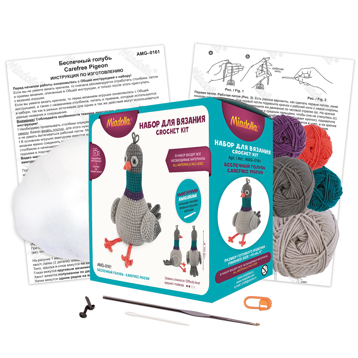 - «Беспечный голубь» (арт. AMG-0161) вяжется крючком в технике амигуруми. У него забавный простодушный образ: со смешным хохолком и в сидячей позе лапами вперед. Высота 15 см.