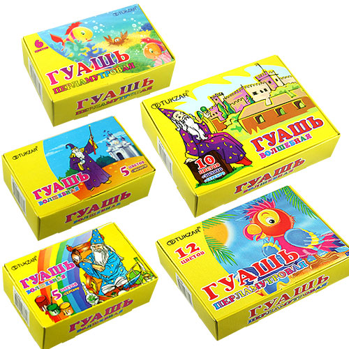 Фасовка по 6 и 12 цветов. Волшебная гуашь 12 цветов включает золотой и серебрянный цвета. Фасовка 6 цветов поставляется с одним золотым или серебрянным цветом.