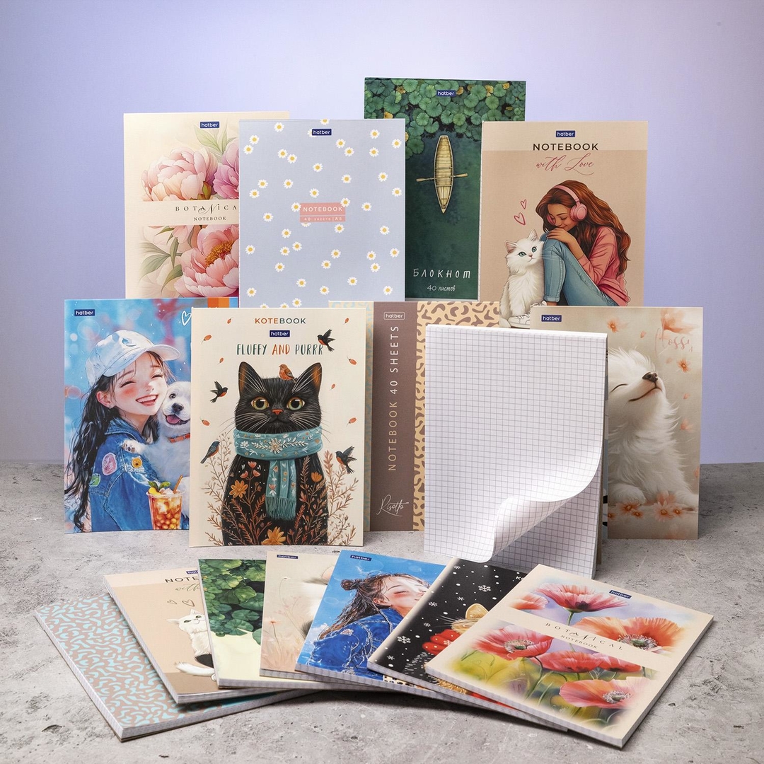 В этой серии Hatber предлагает яркие, насыщенные цветом дизайны с котиками, цветами и портретами. Каждая обложка = позитивное настроение с первого взгляда! Жёсткая подложка позволяет писать в блокнотах даже на весу. Отрывная склейка даёт возможность отрывать лист легким движением руки.