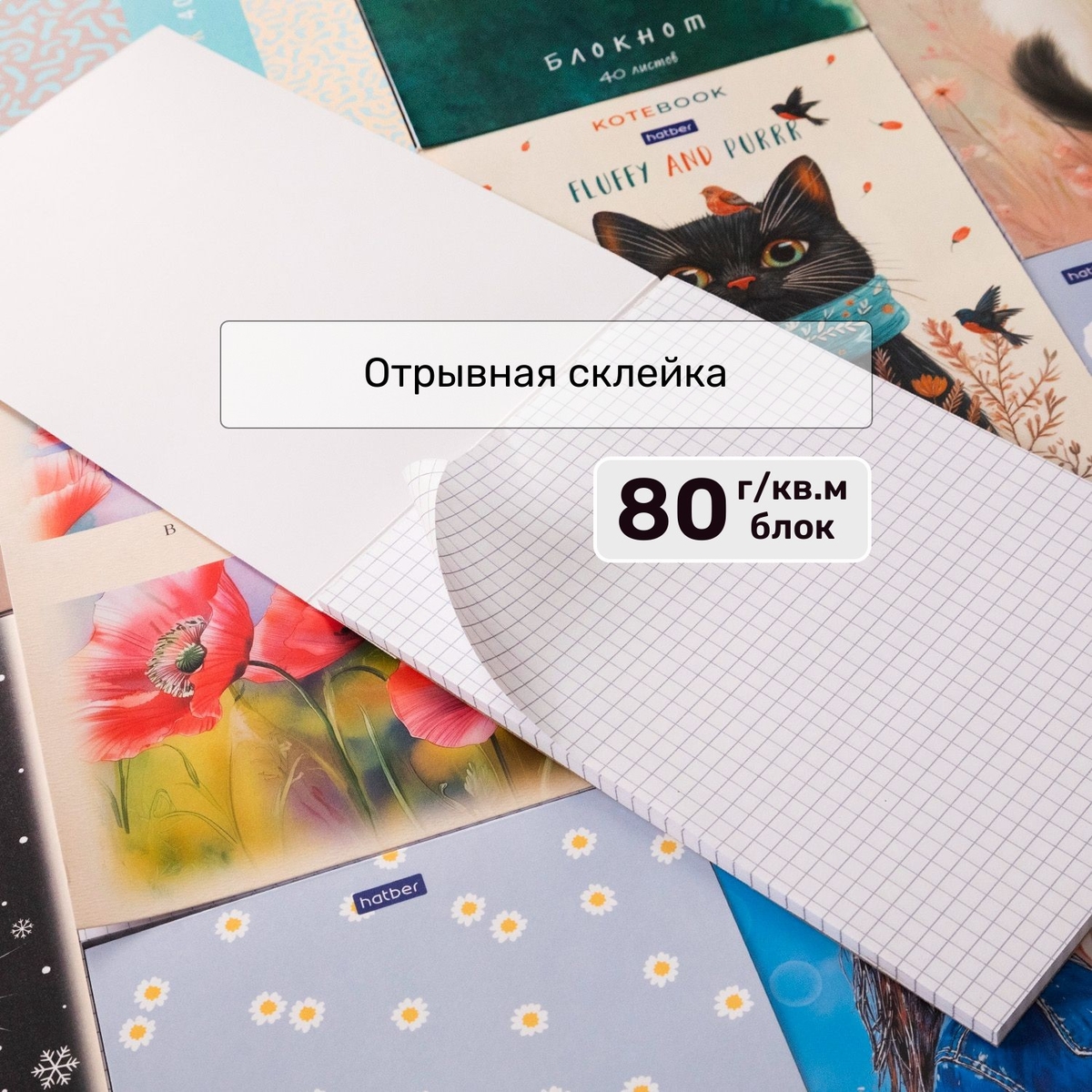 В этой серии Hatber предлагает яркие, насыщенные цветом дизайны с котиками, цветами и портретами. Каждая обложка = позитивное настроение с первого взгляда! Жёсткая подложка позволяет писать в блокнотах даже на весу. Отрывная склейка даёт возможность отрывать лист легким движением руки.