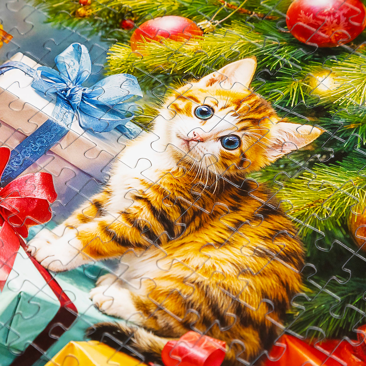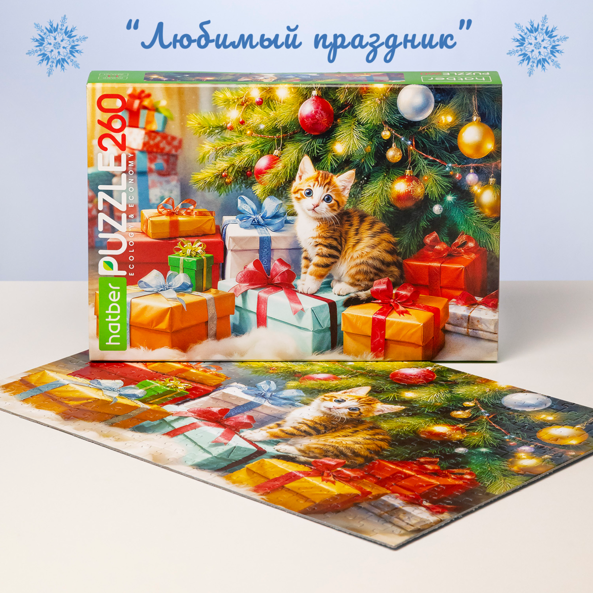 «Любимый праздник» переносит в волшебство Нового года: пушистый котёнок уютно устроился под ёлкой среди подарков, огоньков и разноцветных коробок. В каждом фрагменте — тепло, уют и ожидание чуда.