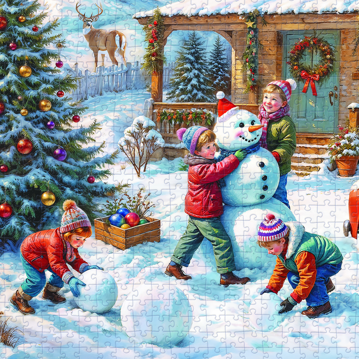 Тёплый свет в окнах, ель в игрушках, старенький пикап с дровами в кузове. Во дворе — дети лепят снеговика, кто-то уже катит огромный снежный ком, у ног крутится пёс, а на бревнах важно сидит кот. Дальше — амбар, санки, даже олень, и тот самый хруст свежего снега.