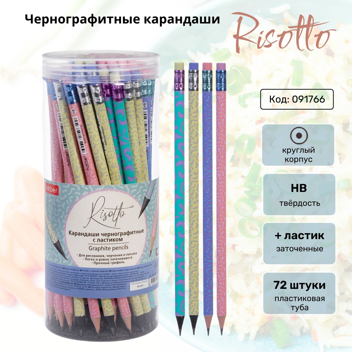 Чернографитные карандаши Risotto от Hatber — отличный вариант для домашней, учебной и рабочей канцелярии! Карандаши с ластиком, с заводской заточкой, с грифелем твердостью HB. Стильно выглядят! Принт на корпусе выполнен из 4 актуальных пастельных оттенков и похож на мелкую текстуру итальянского ризотто.