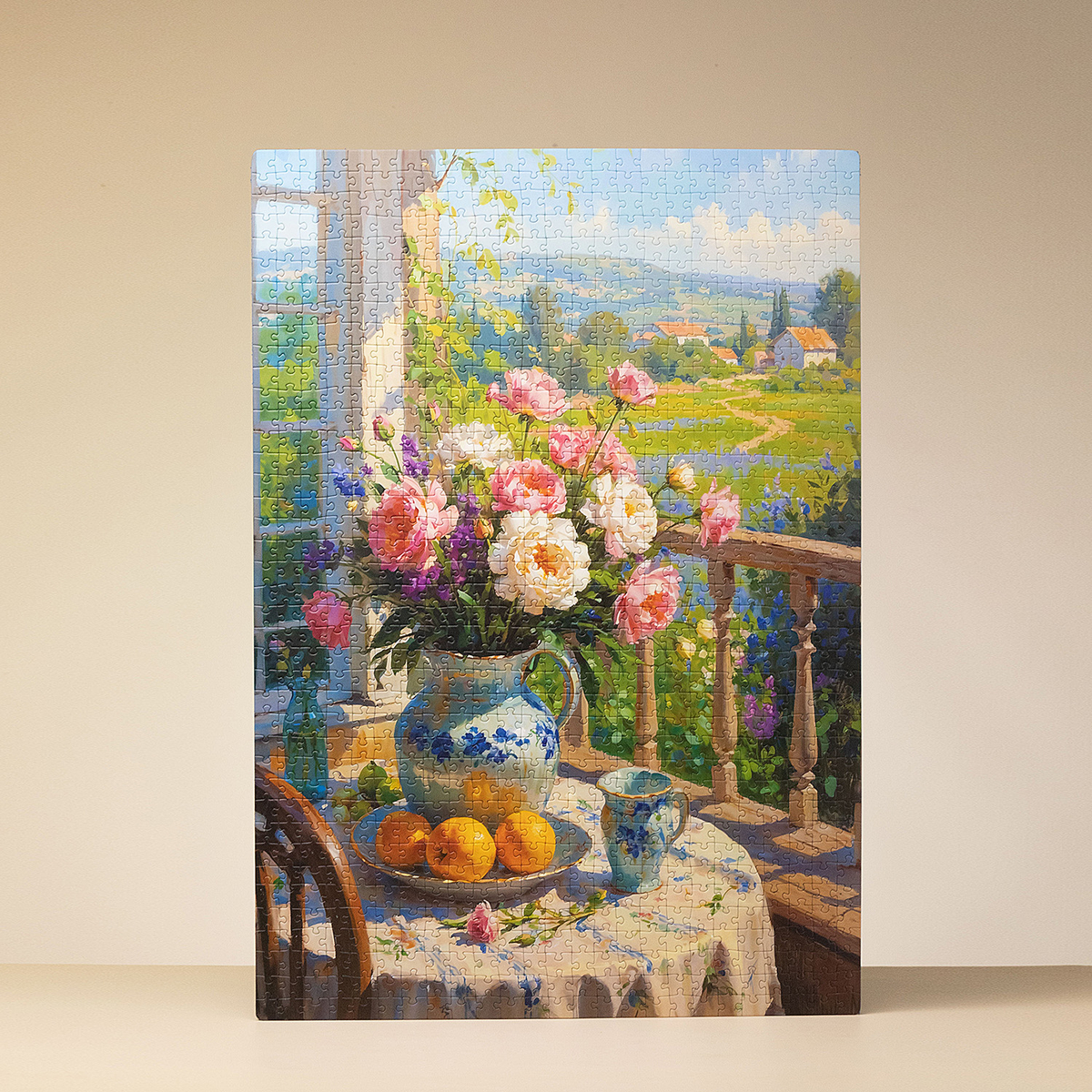 В композиции нет случайных деталей: каждый цветок, отблеск на посуде и фрагмент пейзажа добавляет объёма и делает картину похожей на репродукцию, которая органично смотрится в интерьере кухни или загородного дома.