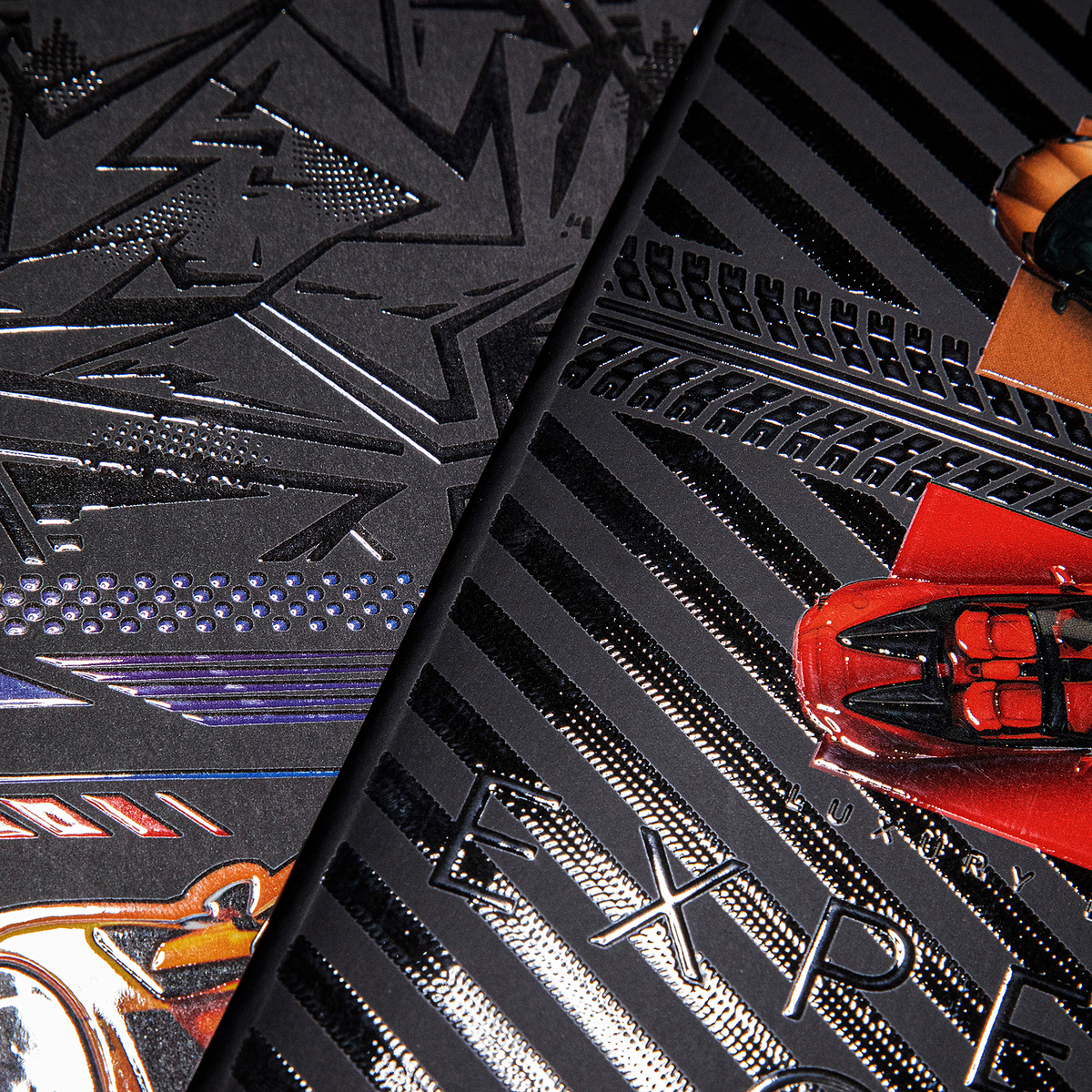 Индивидуальная стилистика дизайнов и объединяющий чёрный матовый фон с 3D-лаком на акцентных элементах.