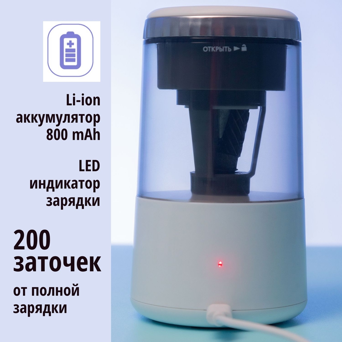 - Li-ion аккумулятор 800 mAh до 200 заточек от полной зарядки.