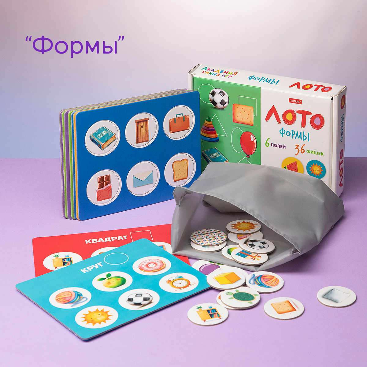 В каждом наборе — 6 игровых полей (размер 158 × 130 мм) и 36 фишек, мешочек для перемешивания фишек ведущим.