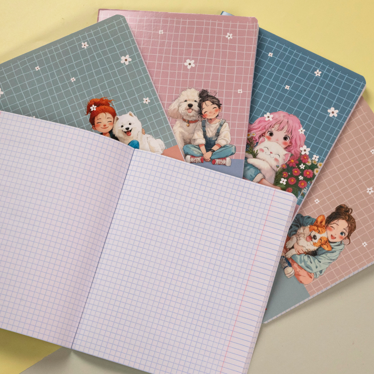 Серия «Пушистые объятия». Нежные оттенки, приятный, немного анимешный стиль иллюстраций на фоне забавного клетчатого принта с цветочками.