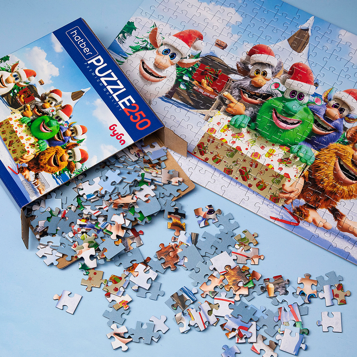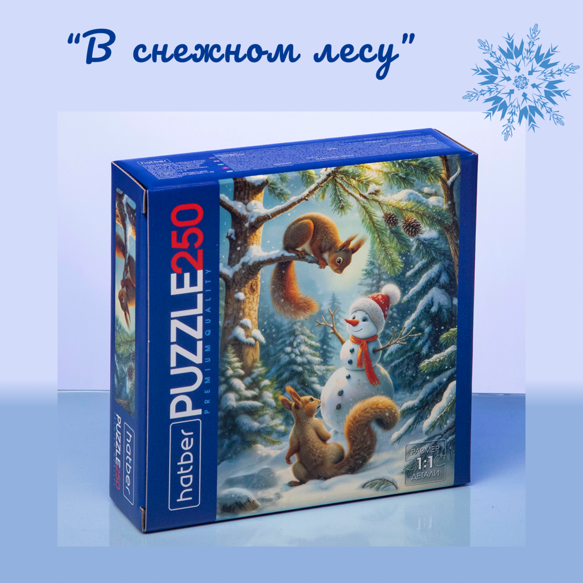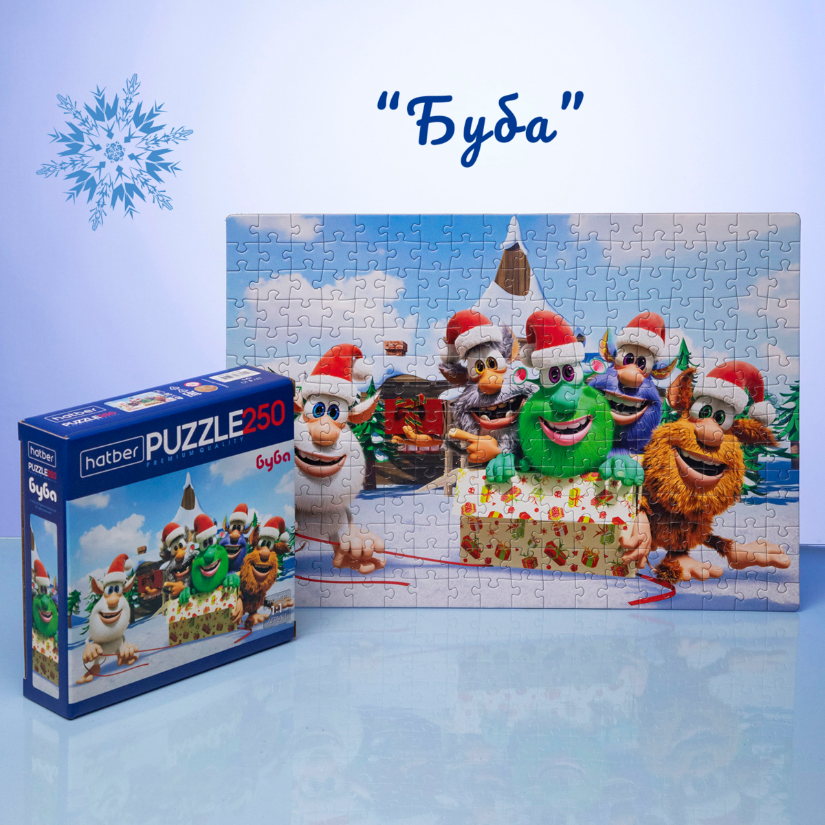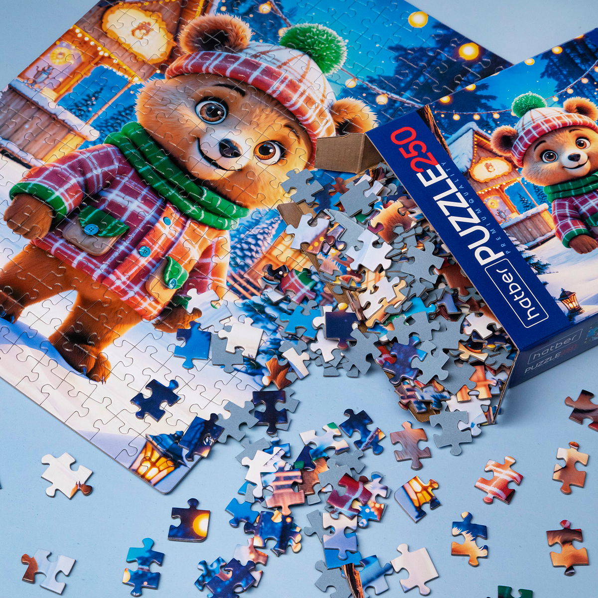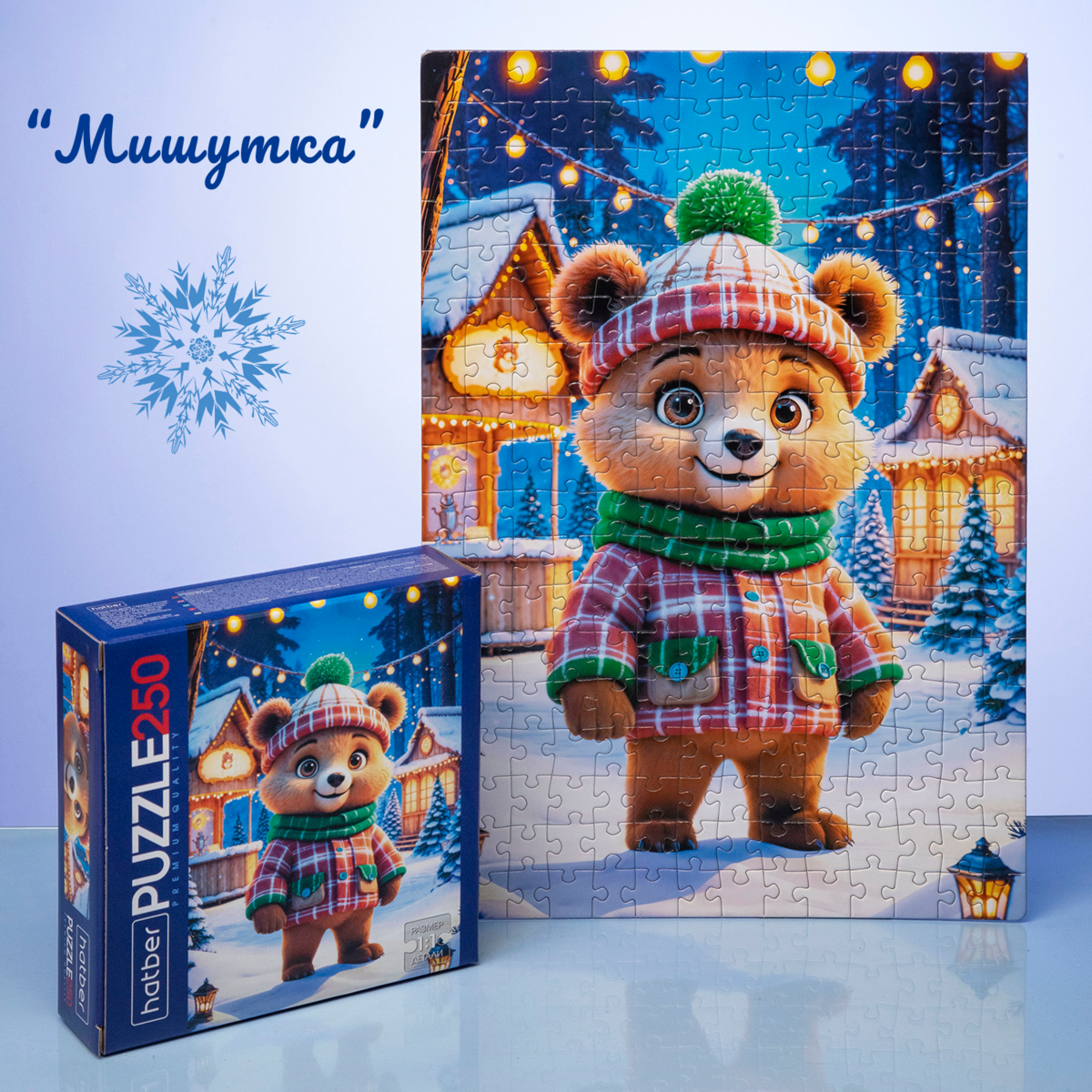 На одном пазле — забавный Буба и его друзья, которые готовят подарки и радуются первому снегу. На другом — пушистый Мишутка в клетчатом шарфике, любующийся огнями зимнего вечера. А рядом, в снежном лесу, белочки и снеговик встречают рассвет среди пушистых елей. Все три сюжета объединяет одно — атмосфера тепла и радости, которую хочется разделить с близкими.