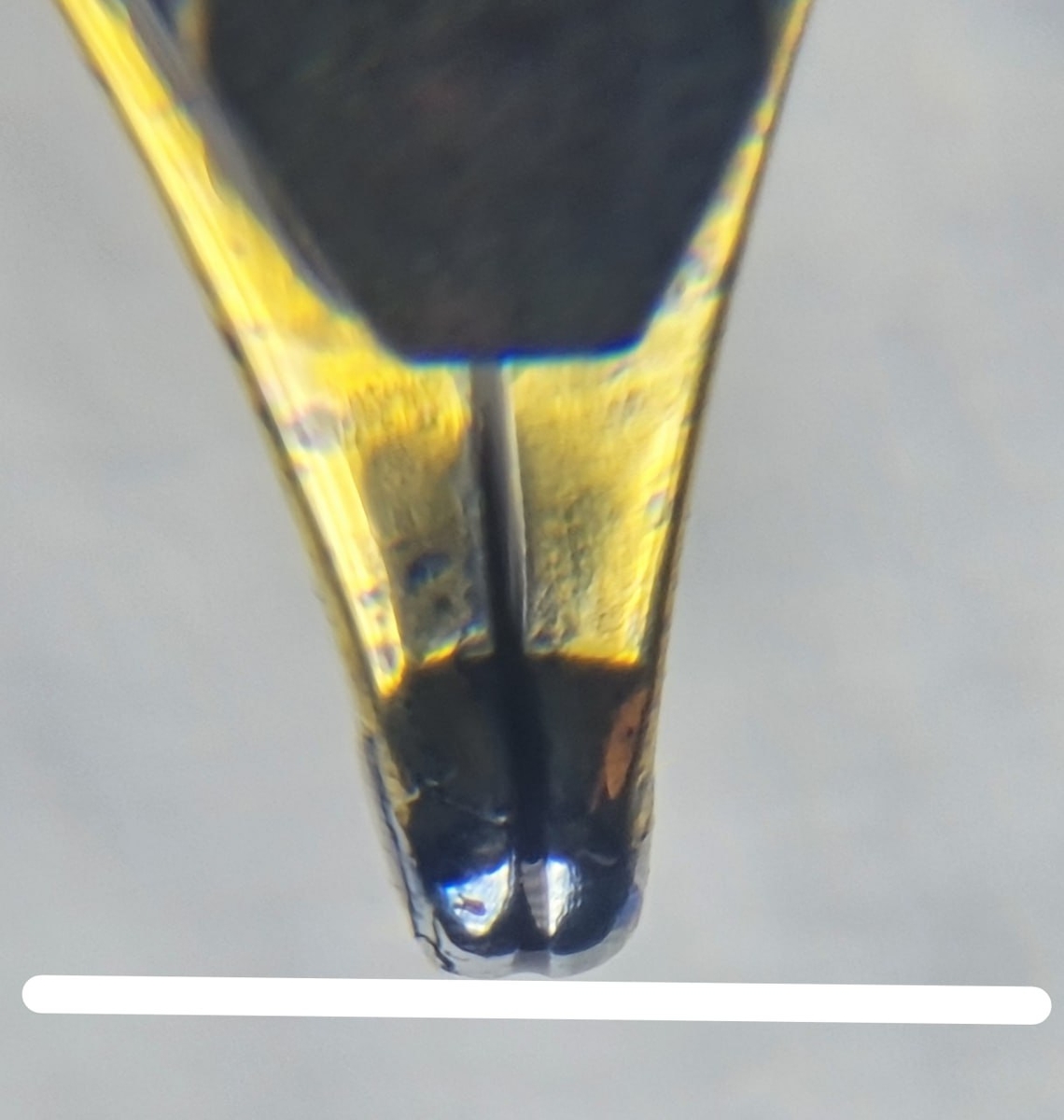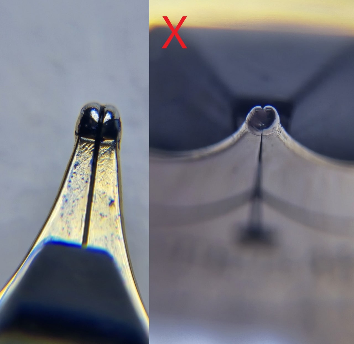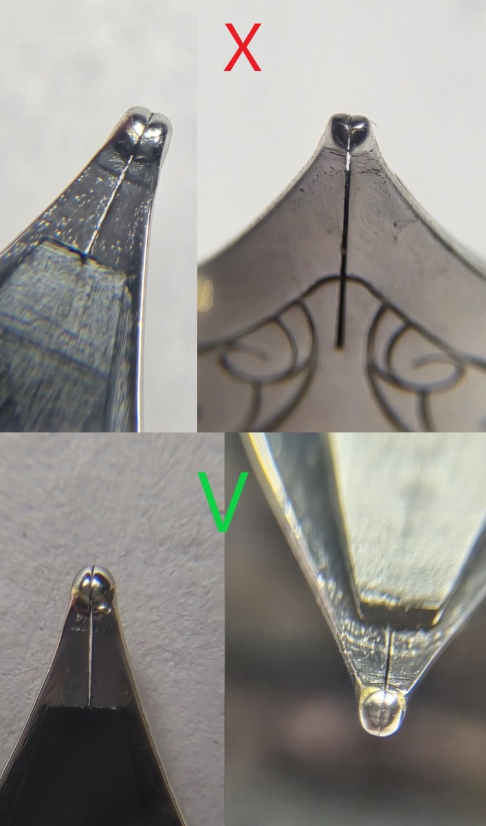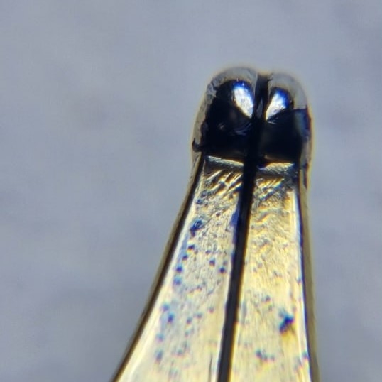 Если геометрия пера и сведение наконечника в норме, то ликвидировать беби-боттом возможно только переточкой, убрав излишки металла и нивелировав тем самым горе-углубление.