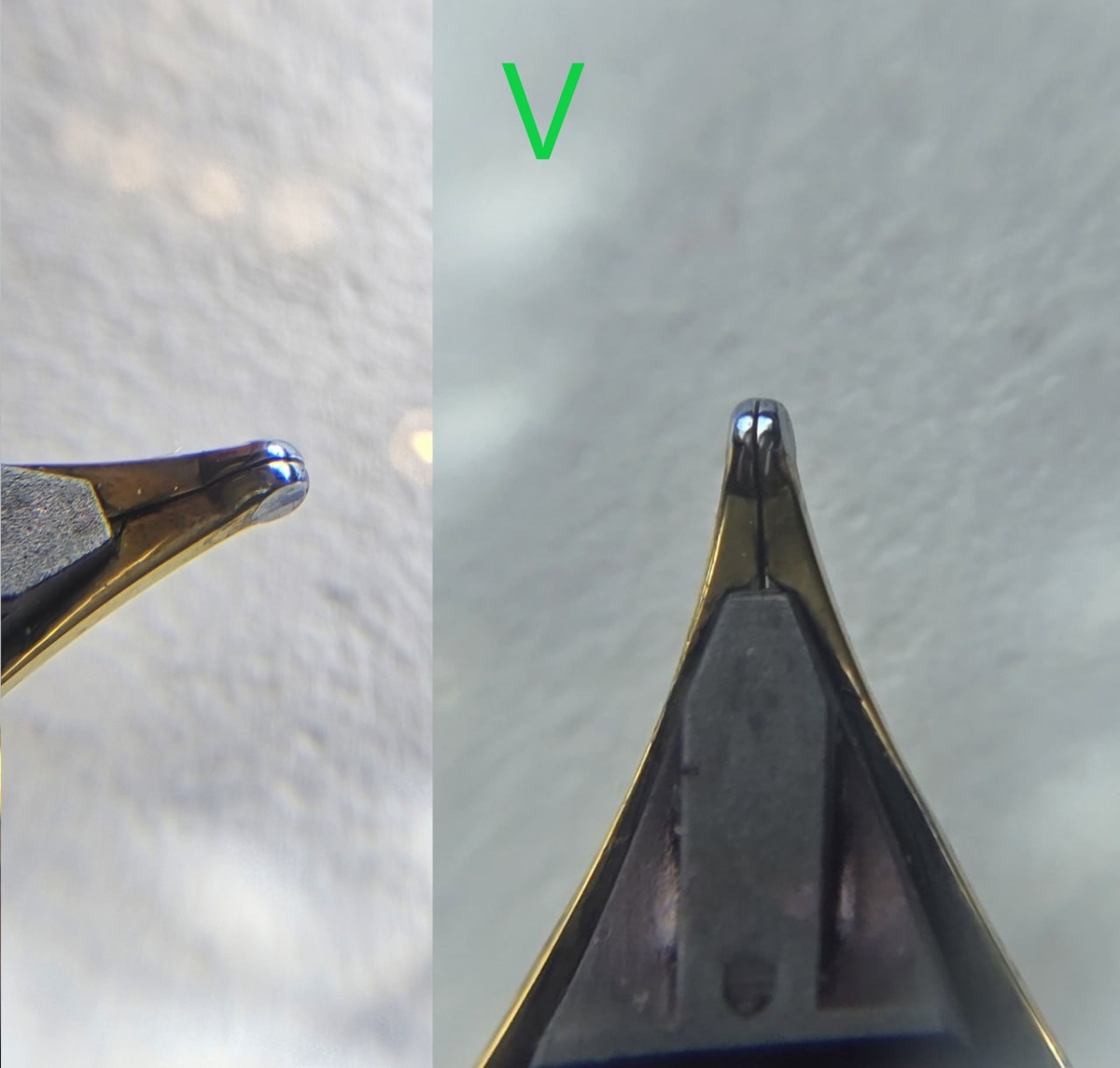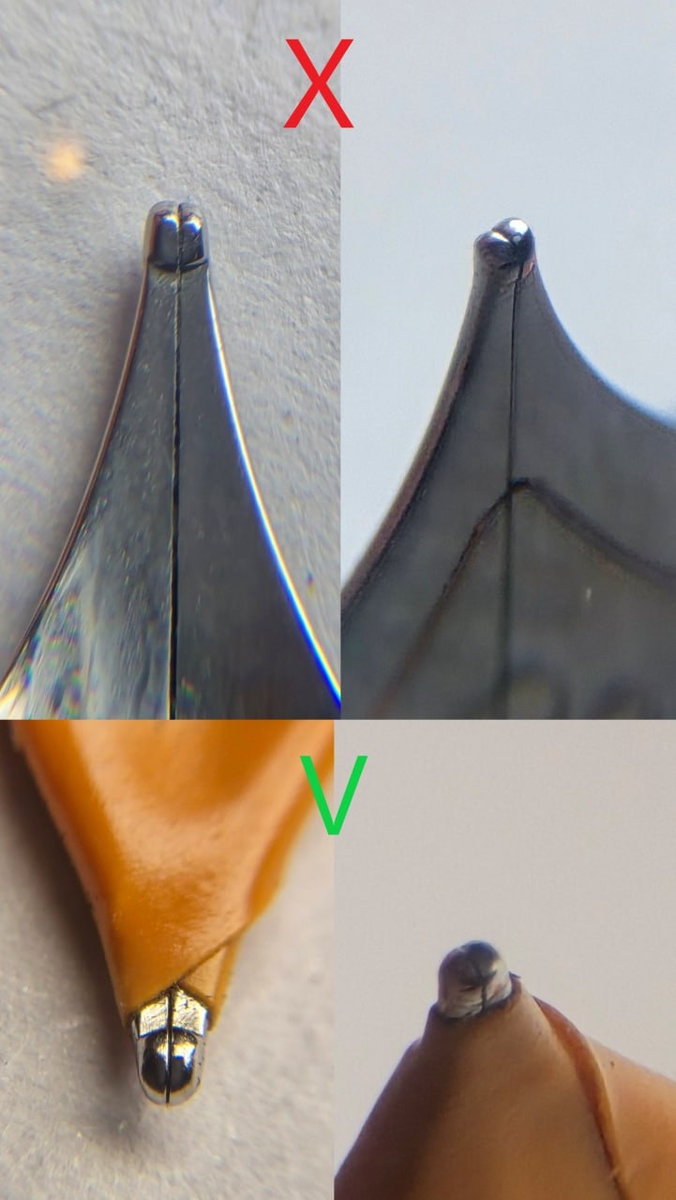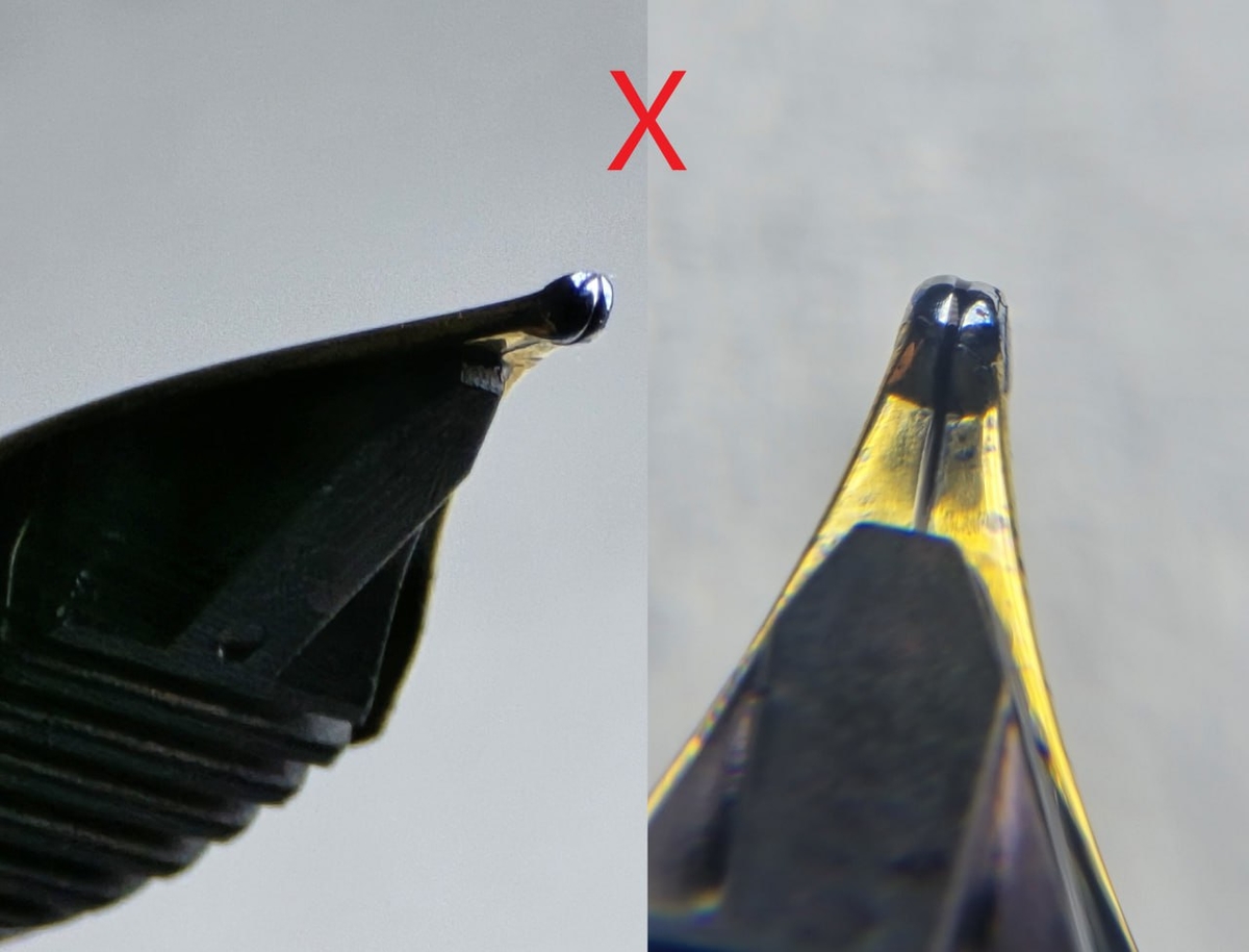 Когда перо имеет геометрию распила, как на схеме с зелёной галочкой выше (дублирую её), при письме его кромка будет «врезаться» в бумагу, а оно — ощутимо её царапать. Например, так ведут себя некоторые современные «самодельные» перья Visconti.