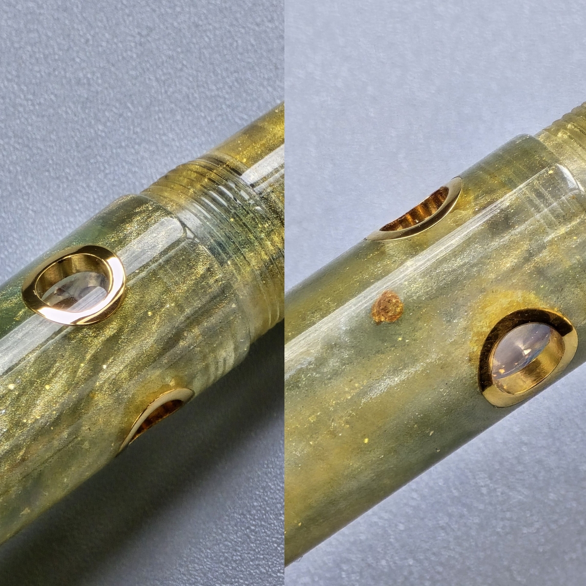 Корпус и колпачок ручки сделаны из акрила. Его качество среднее: заметны дефекты в «замесе». К тому же при сборке не учтена разница цветовой гаммы, и в результате блайндкеп выглядит будто немного инородно.