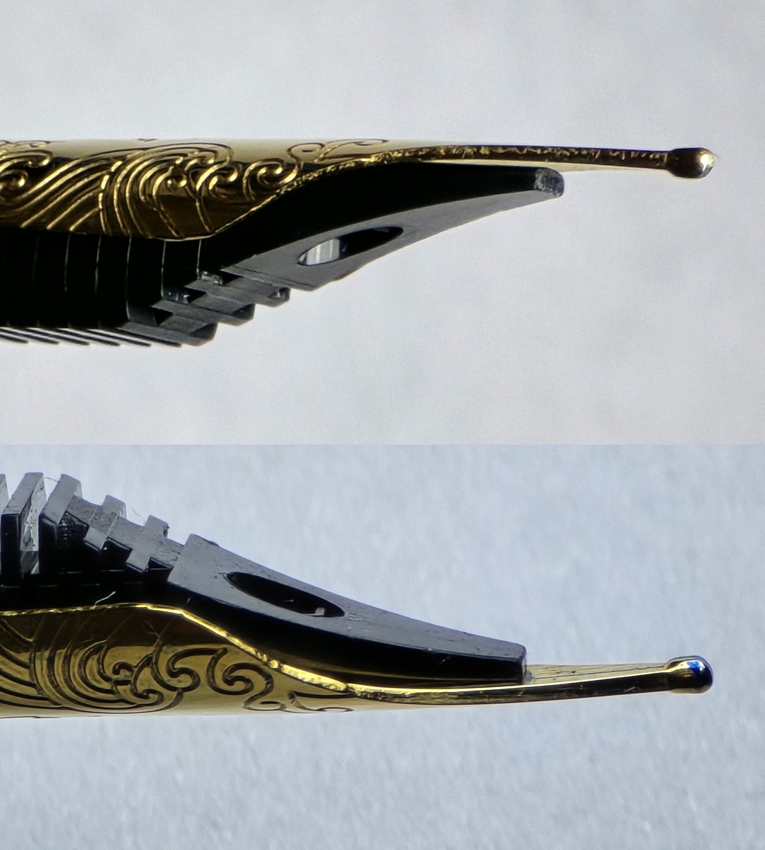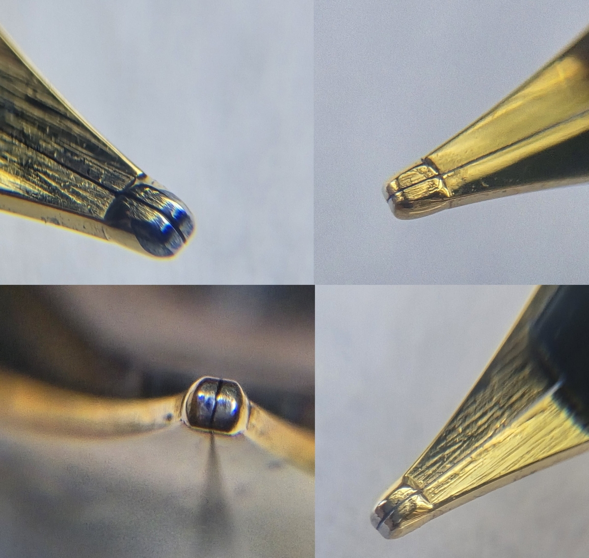 С одной стороны, это позитивно влияет на смачиваемость пера чернилами, но проблема в том, что у напайки было такое же качество обработки. На фотографии рабочая часть уже в процессе полировки…