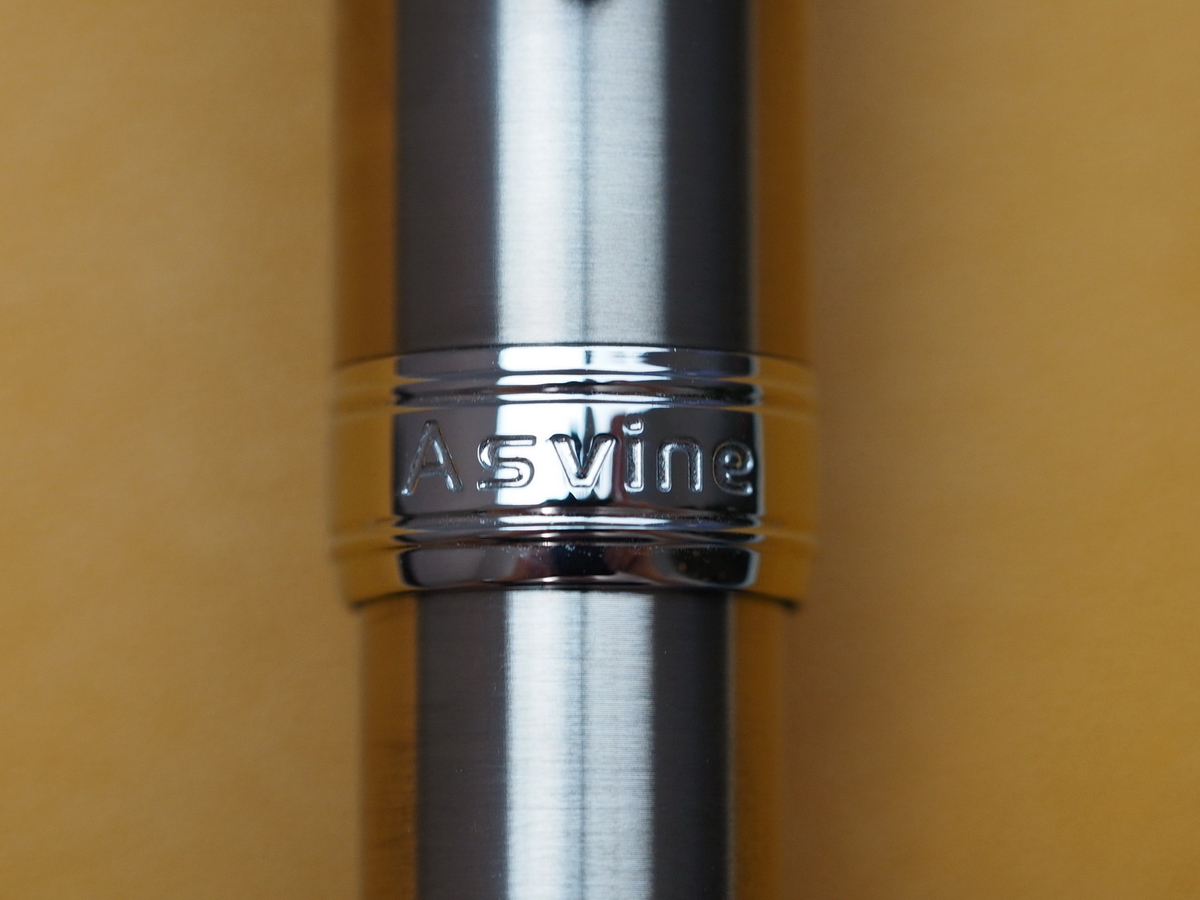 Значит, блестящий серебристый матовый корпус в форме сигары. Серебристые и кажущиеся хромированными упругий клип и широкое кольцо с надписью Asvine с одной стороны и номером-названием модели ручки J16 напротив, с другой.