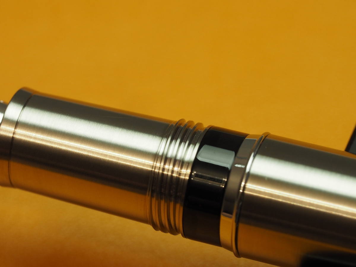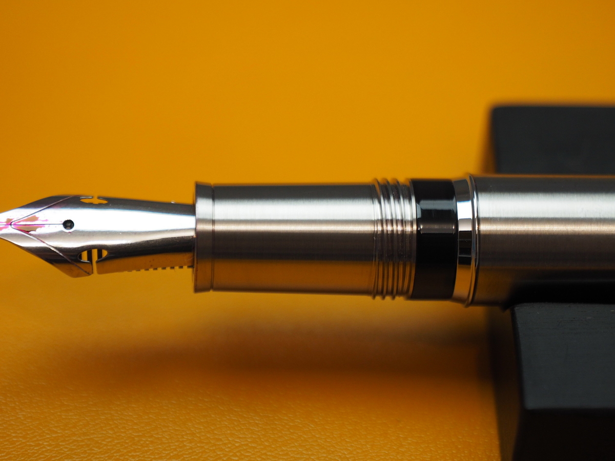 Грип-секция выше всяческих похвал. Может, дело в титане, может — в сатинировании, а может, в форме: плавно сужающийся к перу конус, заканчивающийся бортиком-упором, резко увеличивающимся в диаметре. Он нужен, чтобы пальцы не соскальзывали на перо. Однако секция цепкая и лично для меня с моим средним хватом удобная.