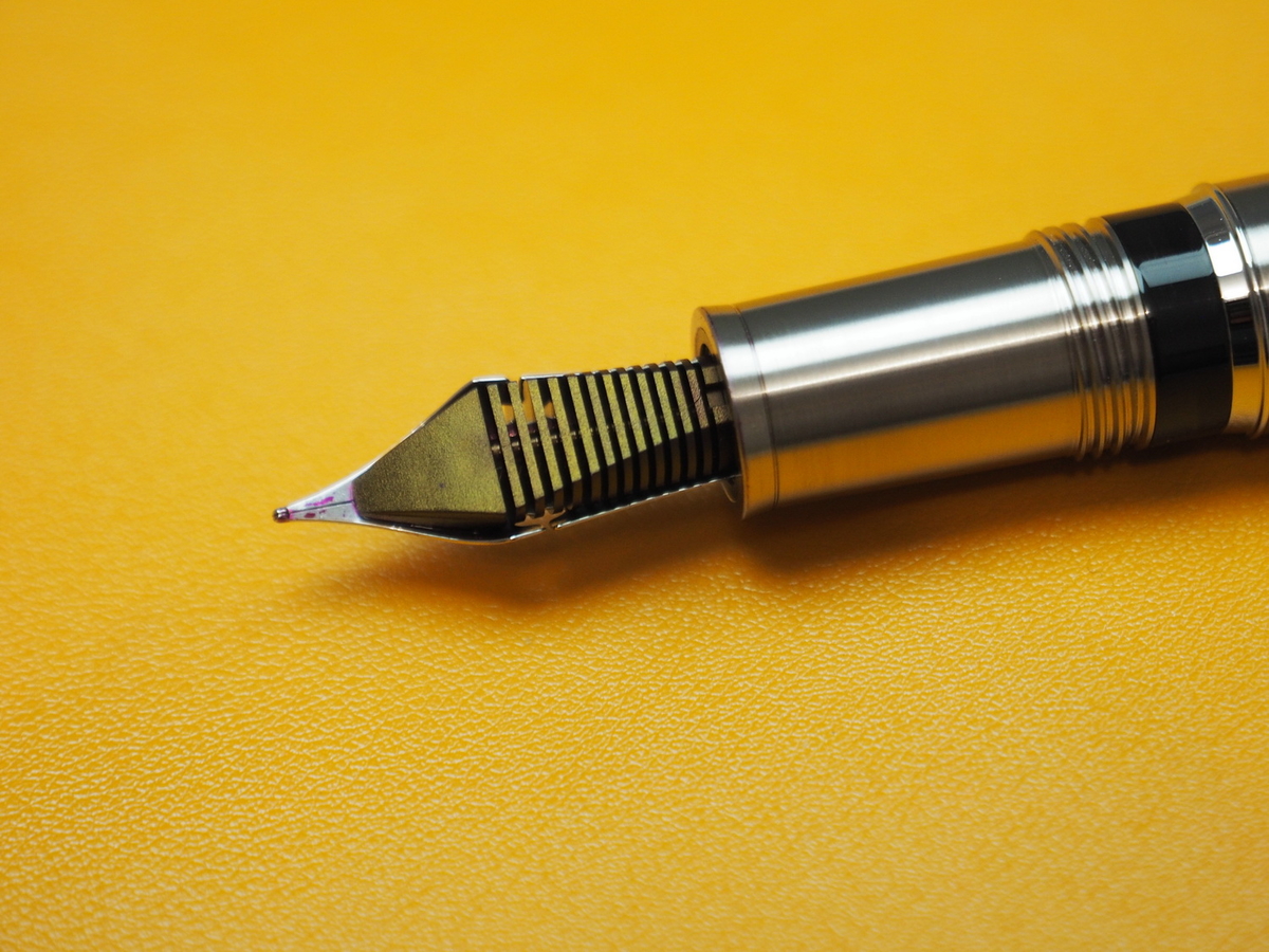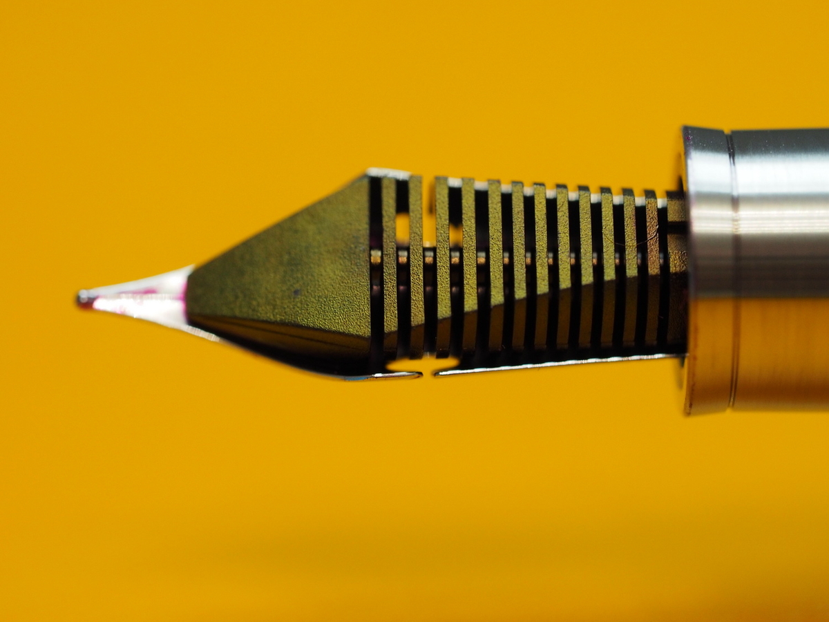 В ручке установлено стальное перо JoWo #6 Flexible. Относительно остальных частей инструмента оно смотрится вполне гармонично. На плечах пера сделаны вырезы, позволяющие половинкам раздвигаться сильнее своих менее гибких собратьев без каких-либо последствий. Однако шибко не радуйтесь, это не те дроиды, что вы ищете, — вернее, не настоящий флекс.