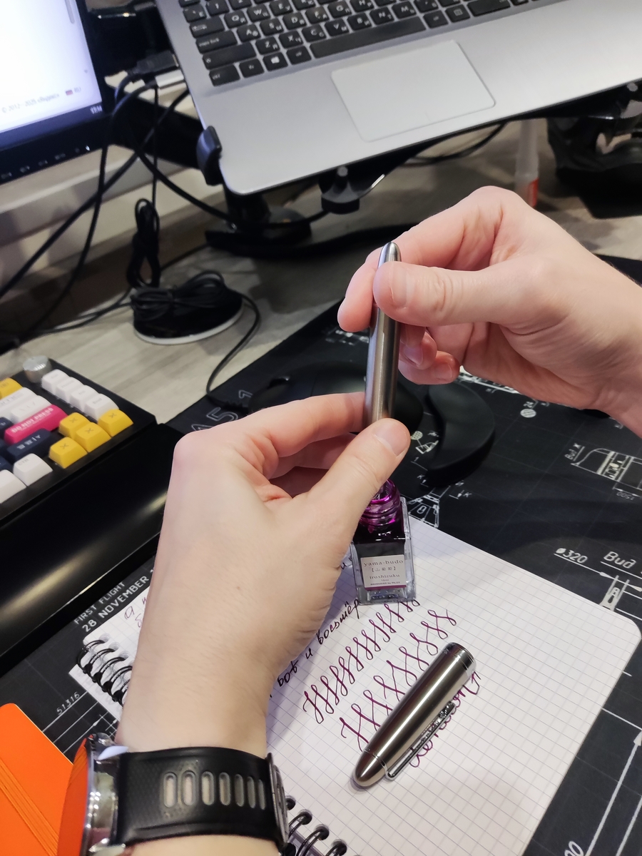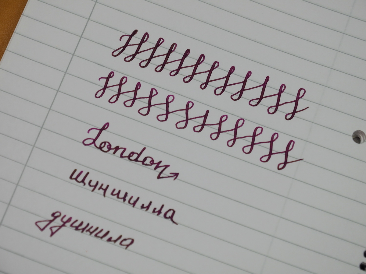 Пишет она с едва уловимым карандашным шорохом. Подача сочная, щедрая, влажная: всё как я люблю. Ещё заправил довольно жидкие чернила — Pilot Iroshizuku Yama-budo, побоявшись, что флексу может не хватить подачи и перо будет «рельсить». Но ошибся, писать такой ручкой и такими чернилами — кайф! «Рельсов» нет, и, думаю, с чернилами посуше да погуще ситуация будет аналогичной.