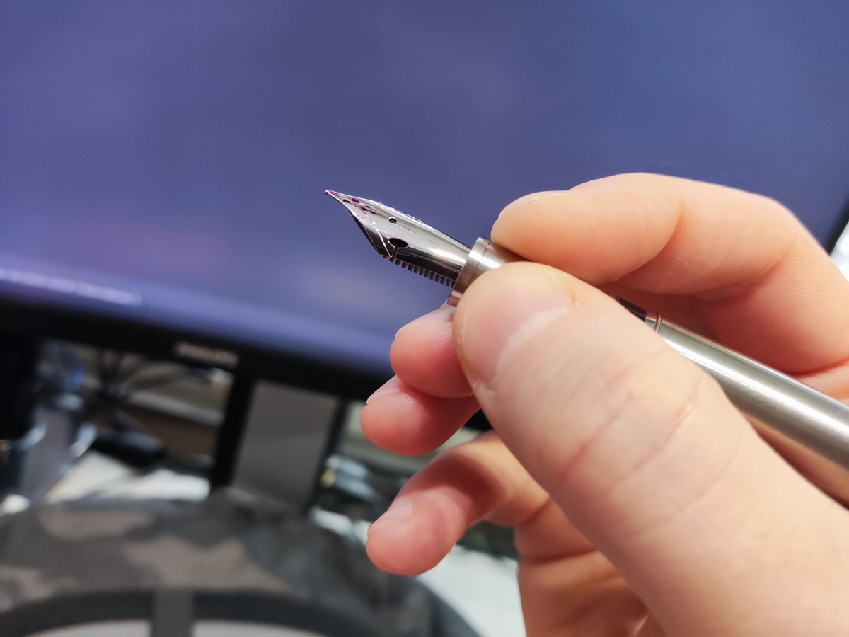 И это я всё ещё пишу, не касаясь потребительских свойств, а они у ручки на высоком уровне. Сами посудите: пишет из коробки (зачёркнуто) из пакета, перо сразу настроено, объём резервуара — 1,7 мл, то есть чуть больше двух картриджей евростандарта, презентабельный внешний вид.