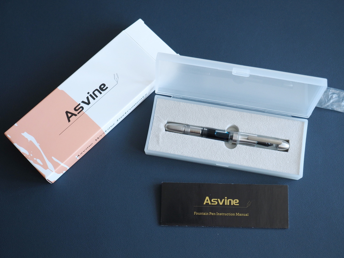 Перьевая ручка Asvine P36 Titanium по желанию поставляется в стандартной пластиковой коробке из полупрозрачного матового пластика. На нижний правый угол верхней крышки нанесён логотип, а точнее, название компании Asvine. Упакована эта коробка была в фирменную картонную обечайку.