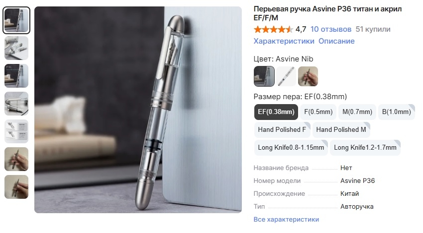 Возможность кастомизации всего одна — установка пера выбранного производителя и размерности. На выбор аж два производителя перьев, собственно, Asvine и Bock, а их размерность представлена в популярных EF, F, M, а у некоторых продавцов можно найти боковский В и асвиновский Stub и местами встречается ручная доводка — в таком случае выбор получается весьма приличный.