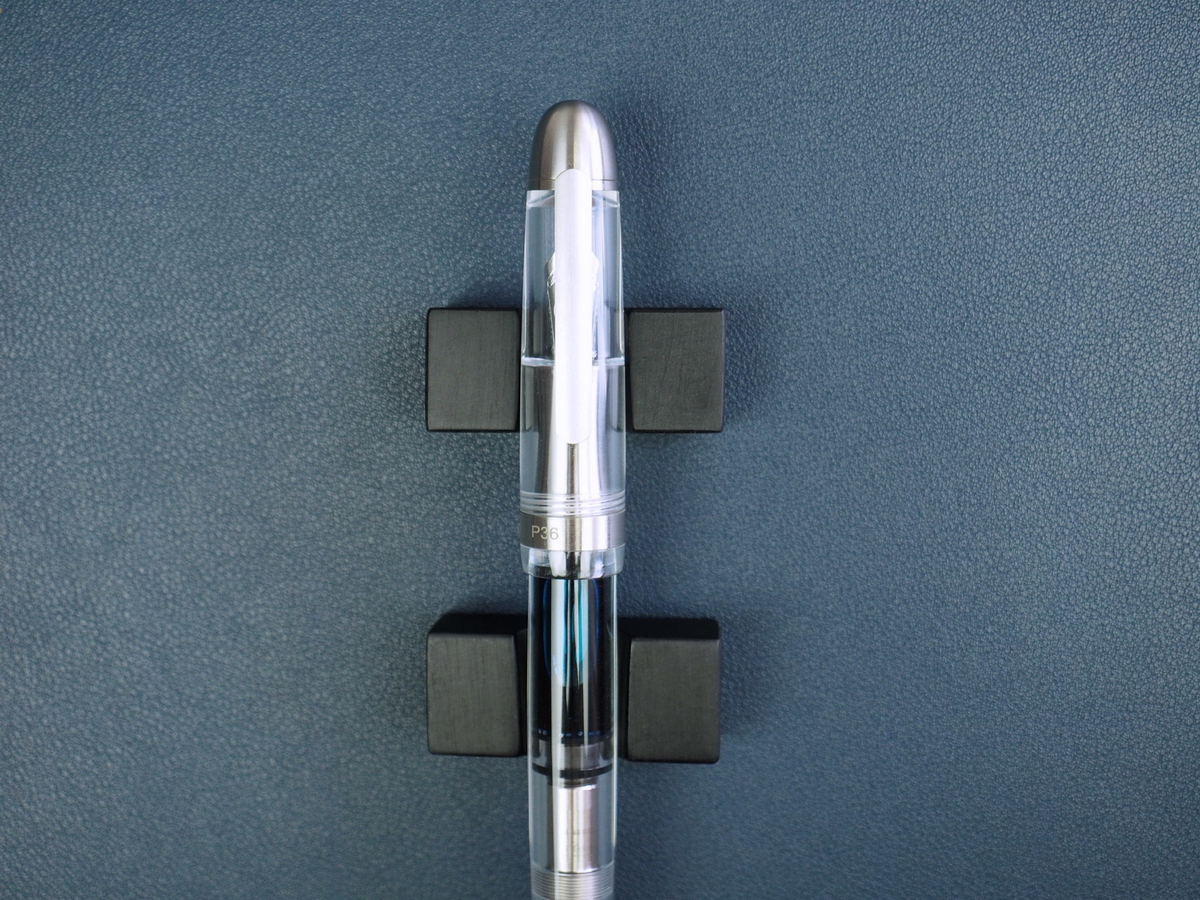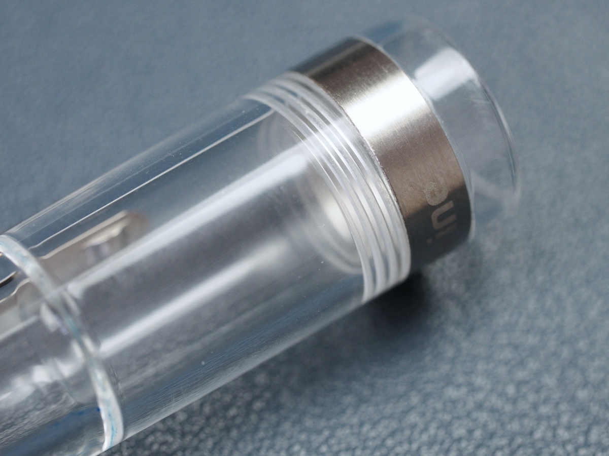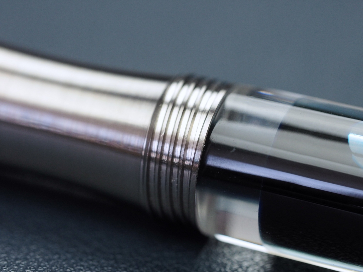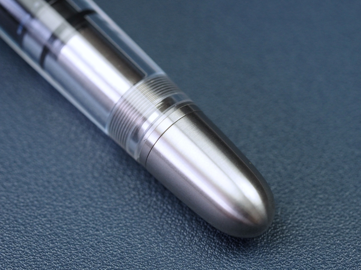 Начну, пожалуй, с системы заправки. Выше я уже писал, что буква P обозначает слово piston, то есть заправка у ручки поршневая. Впрочем, это видно и ни чем не вооружённым глазом, потому что ручка, напомню, демонстратор. Устройство простейшее: внутри ручки установлен металлическая трубка, явно не титановая, даже по цвету отличается, скорее всего, нержавейка. А уже внутри неё — пластиковый шток с рёбрами, оканчивающийся пластиковым же поршнем с двумя резиновыми колечками-прокладками. Задний торец ручки из титана, он же рукоятка поршня. При его вращении шток с втулкой в корпусе опускается вниз, выдавливая воздух из ёмкости для чернил. А при закручивании шток поднимается вверх, засасывая чернила из баночки внутрь ёмкости. Вуаля! Ручка заправлена, а вы великолепны!