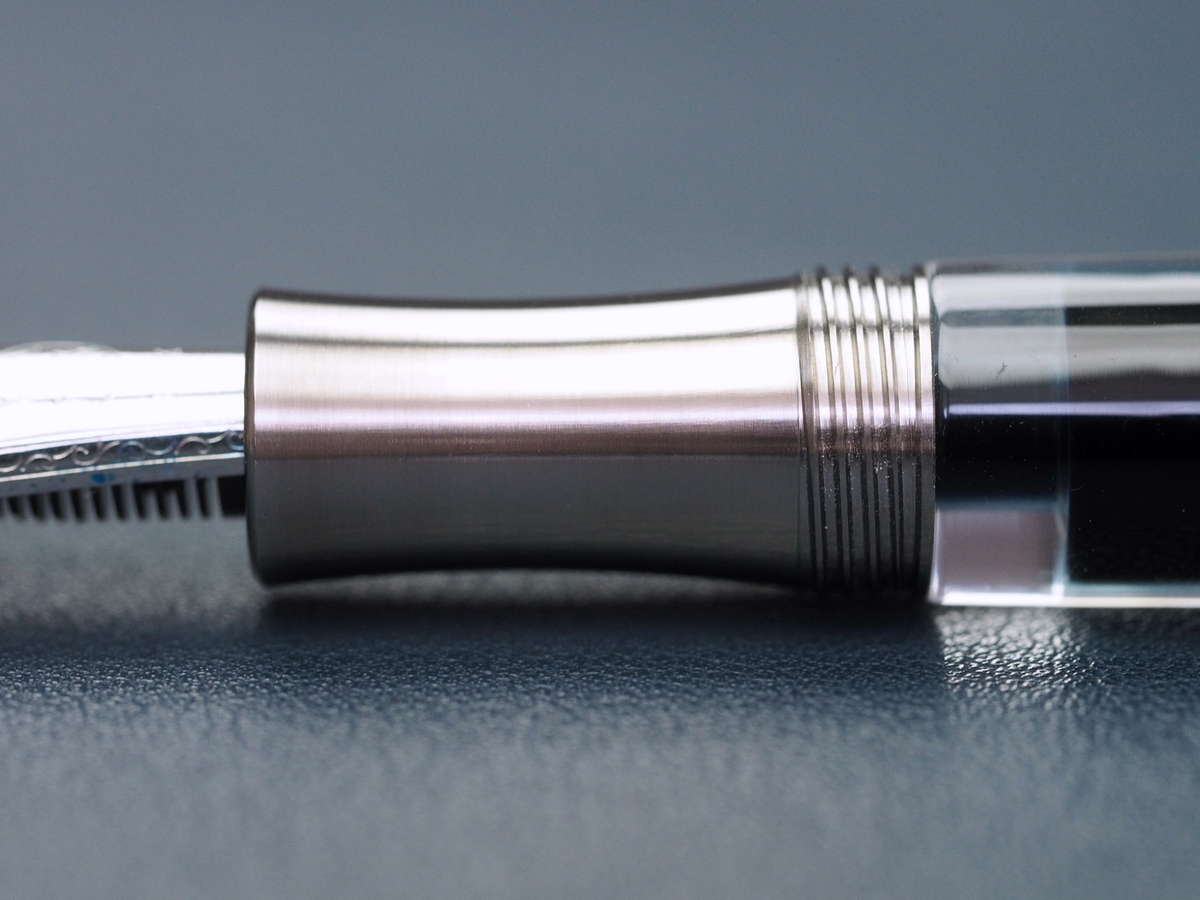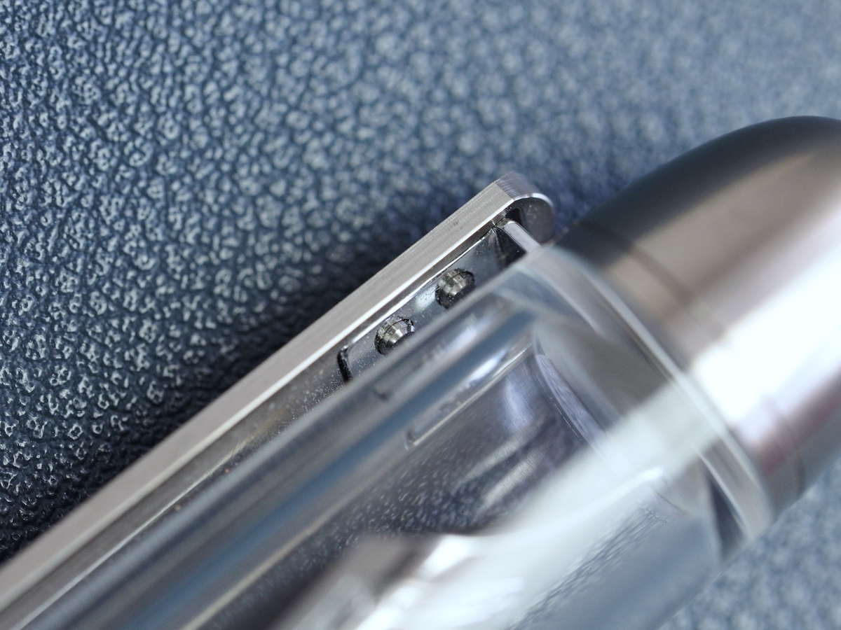Колпачок этой ручки, как водится, прозрачный и, что любопытно, разборный. Титановый торец, ну ок, навершие, сидит на резьбе и откручивается при необходимости. А необходимость есть, когда, например, хочется поправить положение клипа относительно пера: мне нравится, чтобы, если уж это видно, перо располагалось аккурат под клипом.
