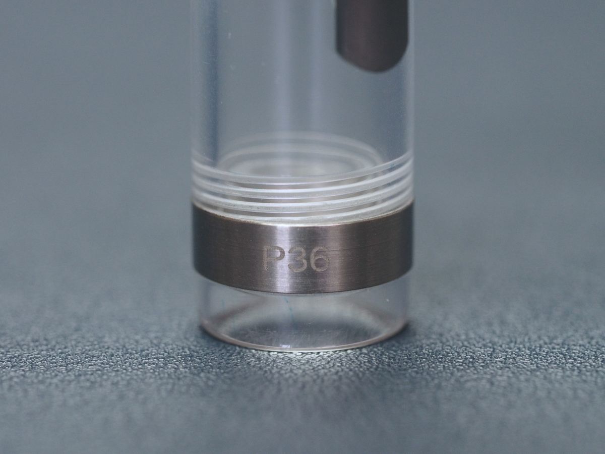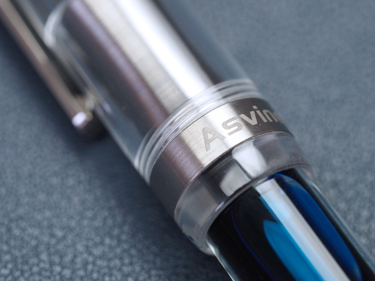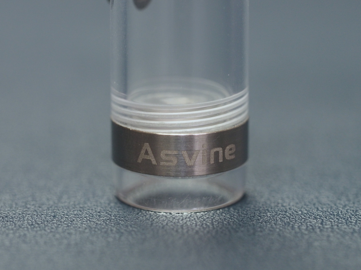 На нижней части колпачка расположилось титановое же кольцо, на него с помощью гравировки нанесены надписи: с одной стороны — Asvine, а аккурат напротив наименование модели P36. От себя добавляю, что шрифт могли использовать и интереснее, особенно для номера модели.