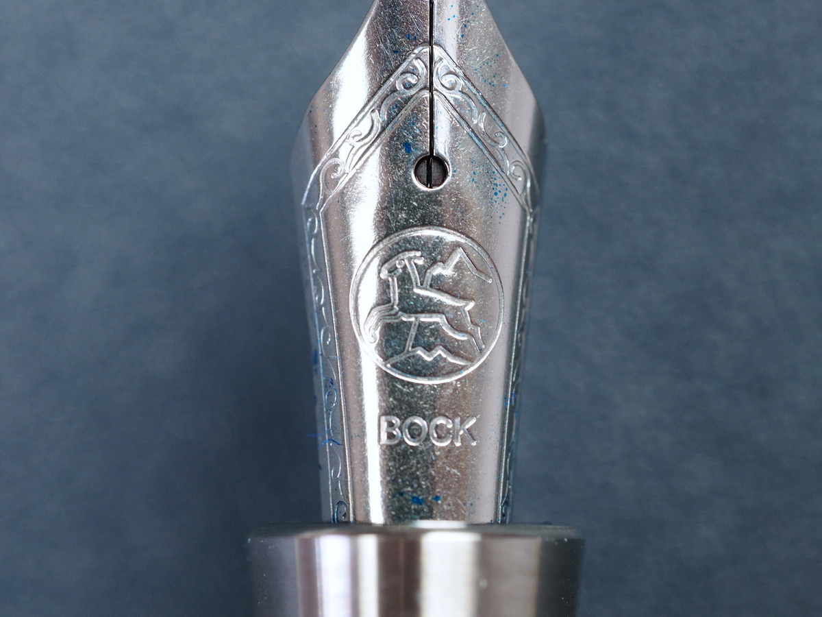 Итак, позвольте представить: стандартное стальное перо компании Peter Bock #6 размерности F. Производитель корпуса в лице Asvine не стал утруждать себя нанесением какой-либо кастомизированной маски или логотипа, поэтому маска пера — хорошо знакомый логотип компании — горный козёл на фоне горы же, вписанный в круг. Под логотипом надпись BOCK, на плечах — стандартный узор.