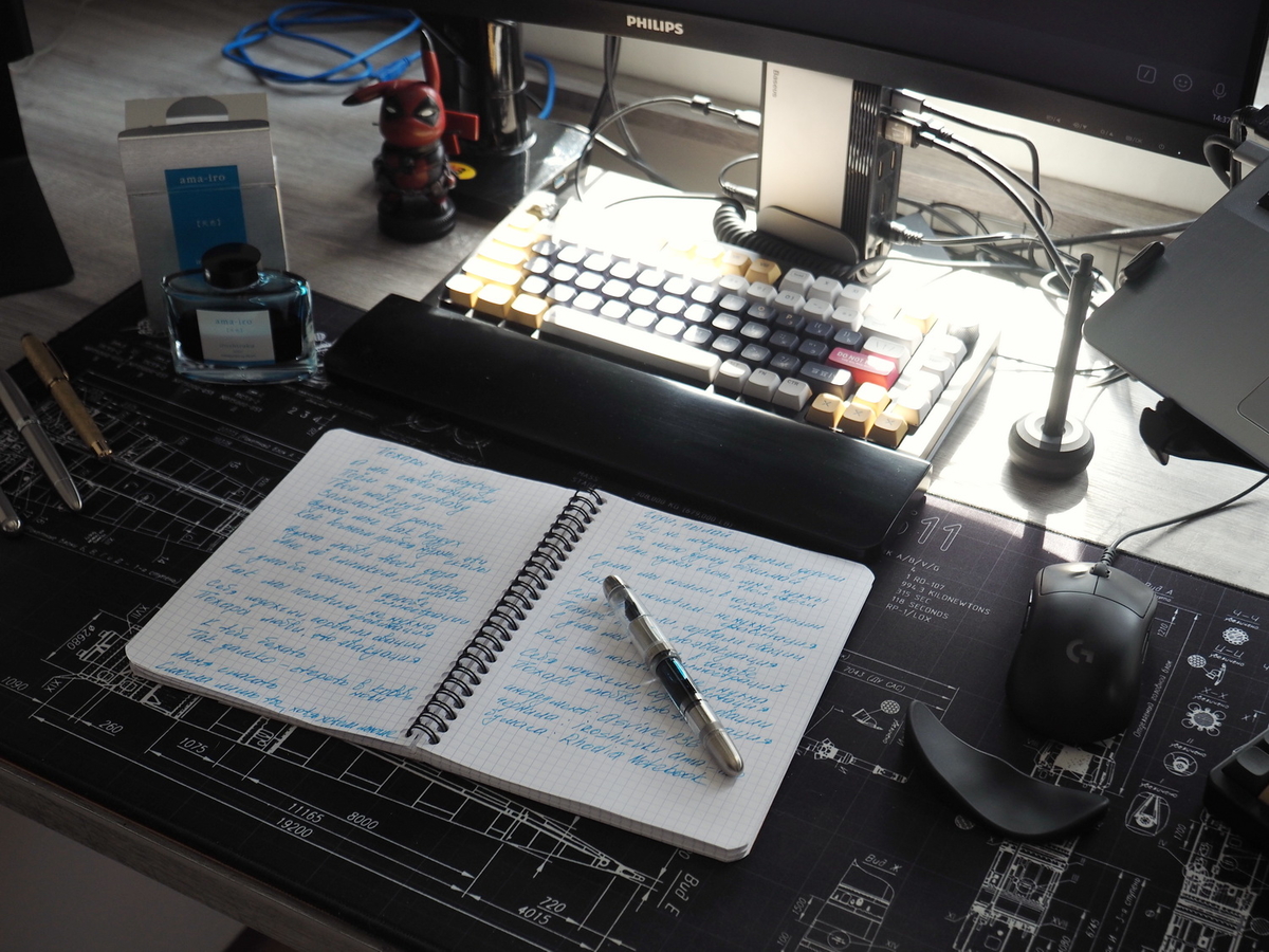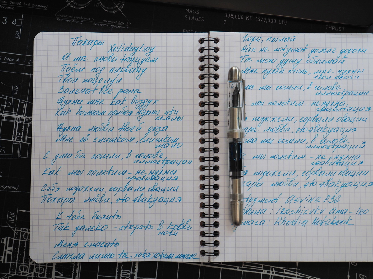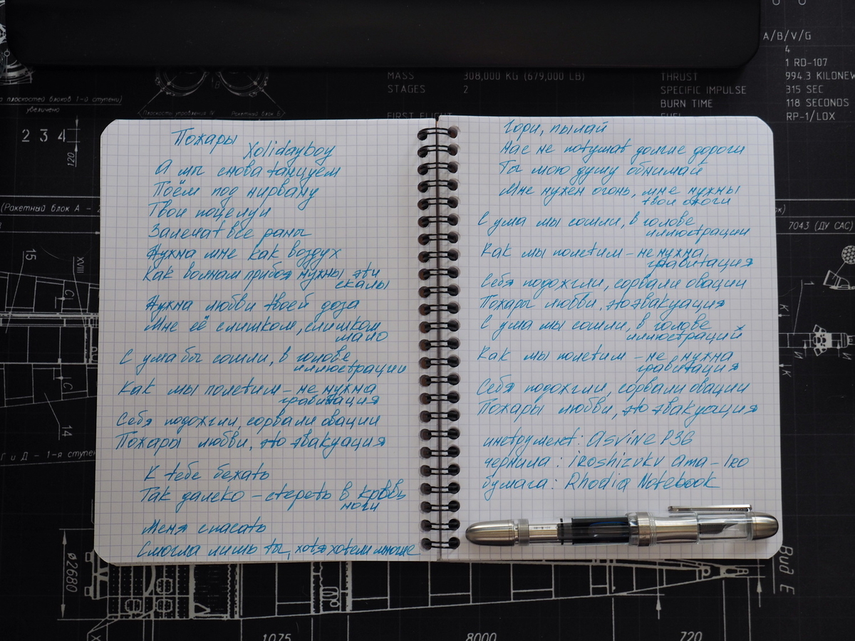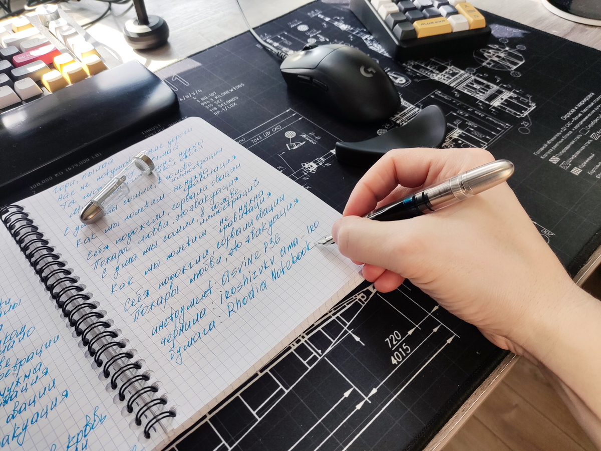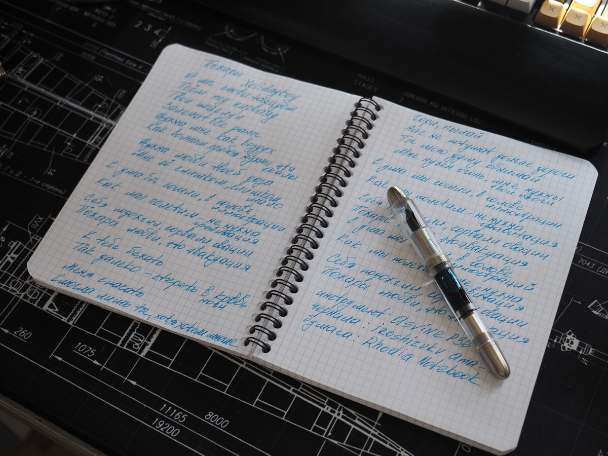 Впечатления от письма у меня самые положительные, не зря ручка попала в регулярную ротацию. Во время письма перо издаёт тихий шорох — не стал бы называть его карандашным, скорее, фломастерным, но не мерзким, скрипучим, а вполне себе приятным.