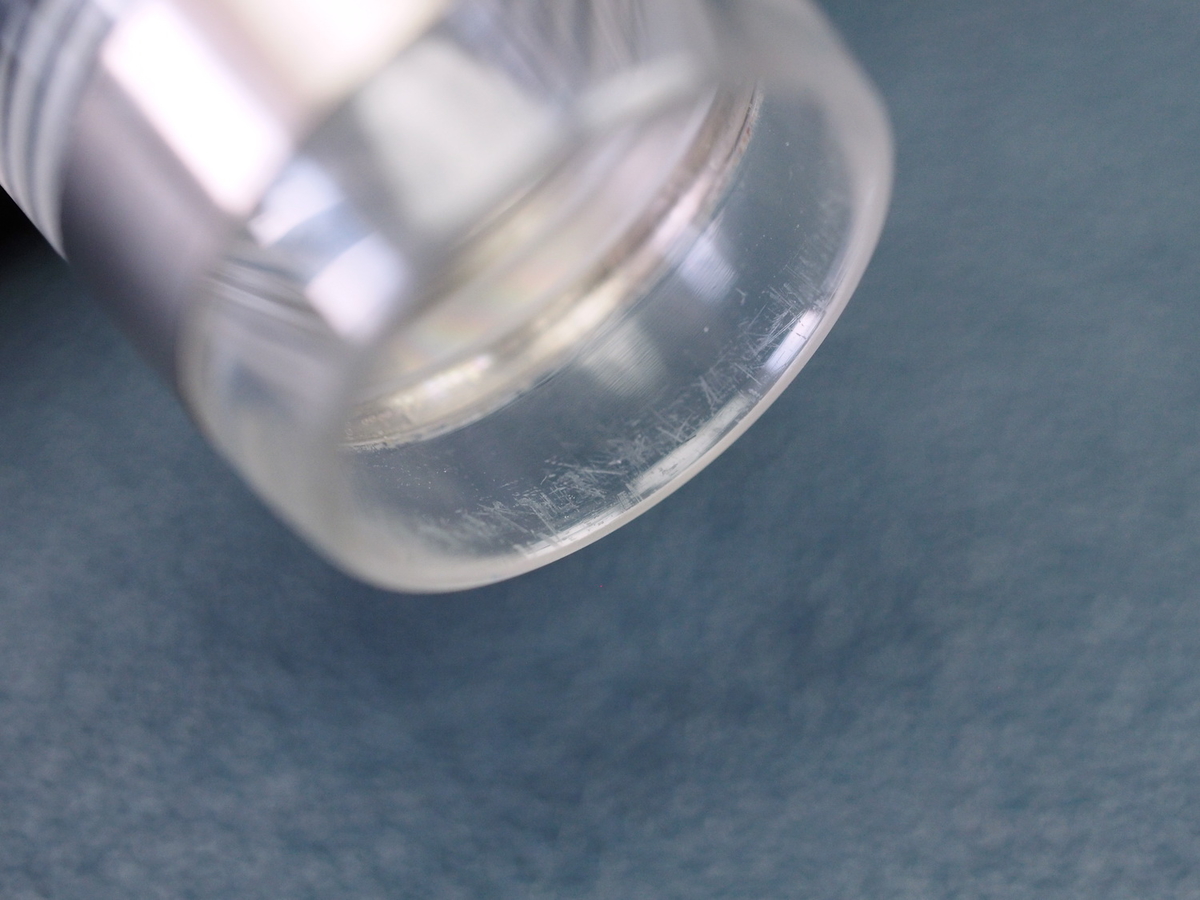 Этот инструмент не первой свежести, я пользуюсь им больше двух лет. За это время она не помутнела, не изменила цвет, царапок на ней не видно. Единственно, что можно увидеть, если знать, куда смотреть, — царапины от пера на нижней кромке колпачка: когда убираешь перо в него, то нет-нет да задеваешь кромку. От регулярного соприкосновения металла с акрилом на последнем остаются микроцарапины, проявляющиеся со временем. В остальном ручка выглядит, будто только из упаковки.